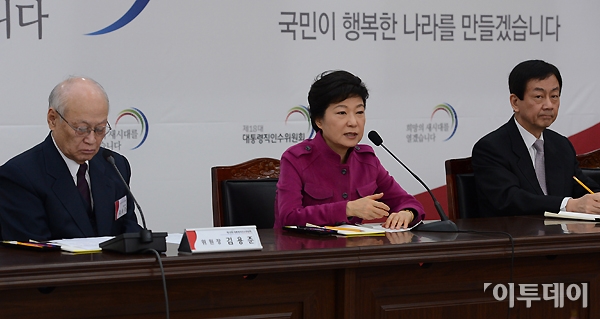 박근혜 당선인이 7일 오전 서울 삼청동 한국금융연수원에서 열린 대통령직 인수위원회 전체회의에서 인사말을 하고 있다. 인수위사진기자단