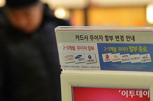 최근 주요 카드사들이 무이자 할부 서비스를 중단한 가운데 7일 서울의 한 대형마트 계산대에 특정 카드사의 할부 정책 변동 안내문이 부착돼 있다.
