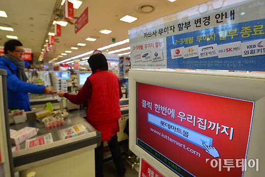 최근 주요 카드사들이 무이자 할부 서비스를 중단한 가운데 7일 서울의 한 대형마트 계산대에 특정 카드사의 할부 정책 변동 안내문이 부착돼 있다.