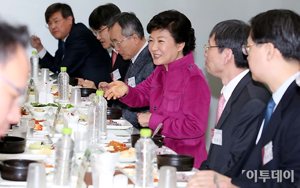 박근혜 대통령 당선인이 7일 오후 삼청동 한국금융연수원 대통령직 인수위원회에서 전체회의를 마친 후 인수위원들과 오찬을 함께하고 있다. 인수위사진기자단