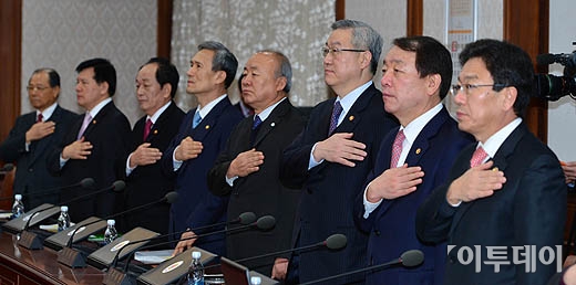 국무위원들이 8일 오전 서울 세종로 정부서울청사에서 열린 국무회의에서 국민의례를 하고 있다.