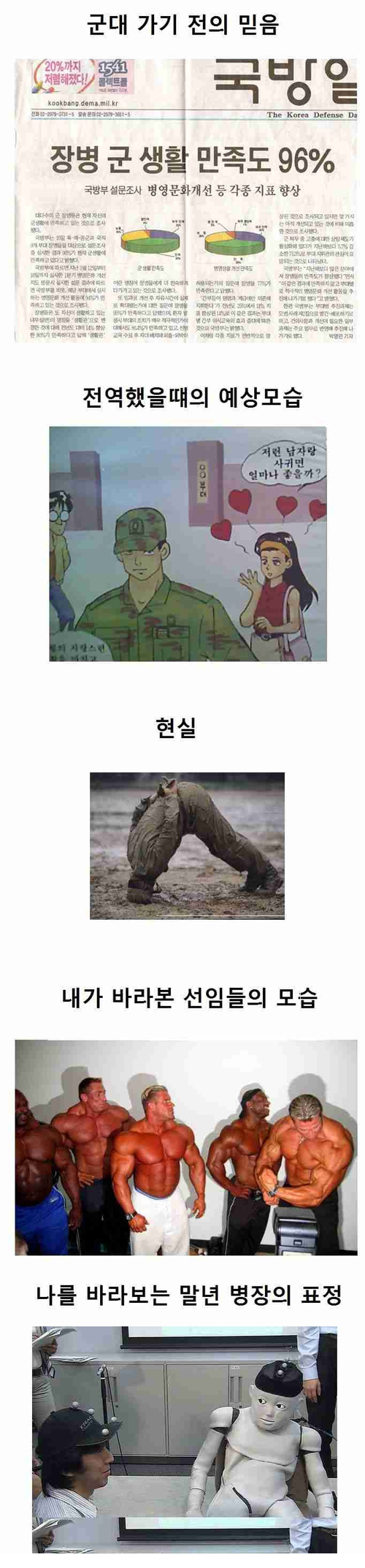 세 번째 사진에선 진흙 위에서 기합을 받고 있는 참담한 모습의 군인이 등장해 보는 이들을 안타깝게 하고 있다. 더불어 네 번째 사진에서는 ‘내가 바라본 선임들의 모습’이라는 설명과 함께 우람한 근육을 가진 보디빌더가 등장한다. 강해 보이는 모습에 기가 죽는다는 것이다.