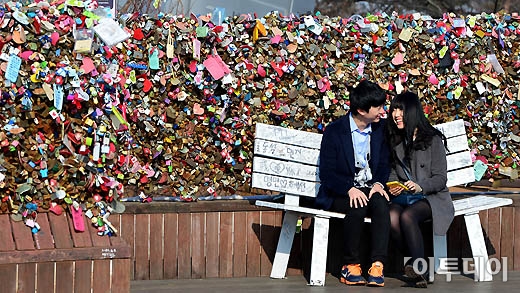 전국 대부분 지방의 추위가 한 풀 꺾이고 맑은 날씨를 보인 8일 오후 서울 N타워를 찾은 연인들이 사랑의 자물쇠 앞에서 데이트를 즐기고 있다.