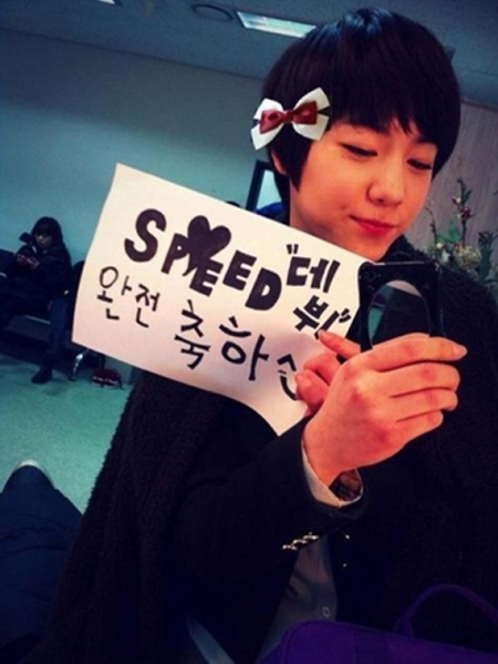 공개된 사진 속 효영은 'SPEED 데뷔 완전 축하'라는 글이 적힌 종이를 들고 있는 모습이다.