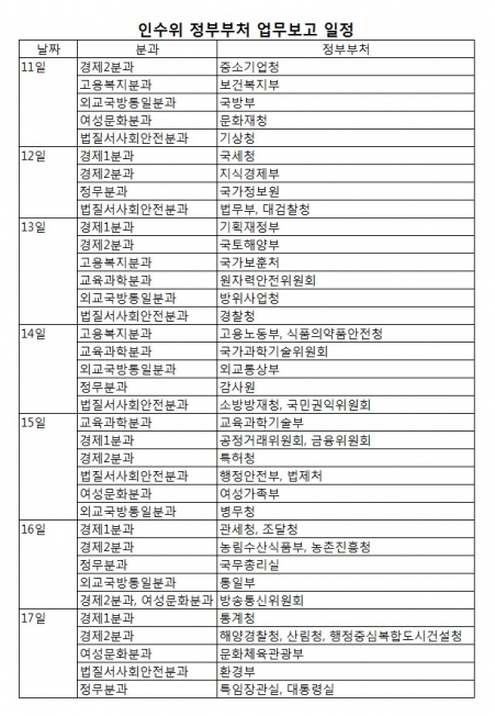 대통령직 인수위원회는 오는 11일부터 일주일간 경제와 비경제분과로 나눠 1일·1분과별로 46개 정부부처의 업무보고를 받기로 했다. 첫날 대상 부처는 중소기업청, 보건복지부, 국방부, 문화재청, 기상청으로 정해졌다. 이어 국세청·지식경제부, 기획재정부·국토해양부, 고용노동부, 공정위·금융위 등의 순으로 업무보고가 진행된다. 또 인수위는 업무보고 진행시 낮은 자세를 견지해 명함을 사용하지 않기로 의견을 모았다.