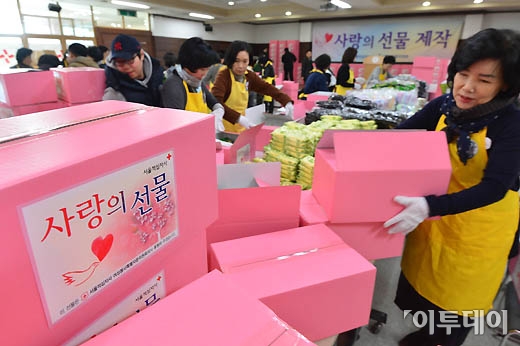 대한적십자사 자원봉사자들이 9일 오후 서울 마장동 서울지사 강당에서 저소득층 노인들에게 전달할 '사랑의 선물' 포장 봉사를 하고 있다.