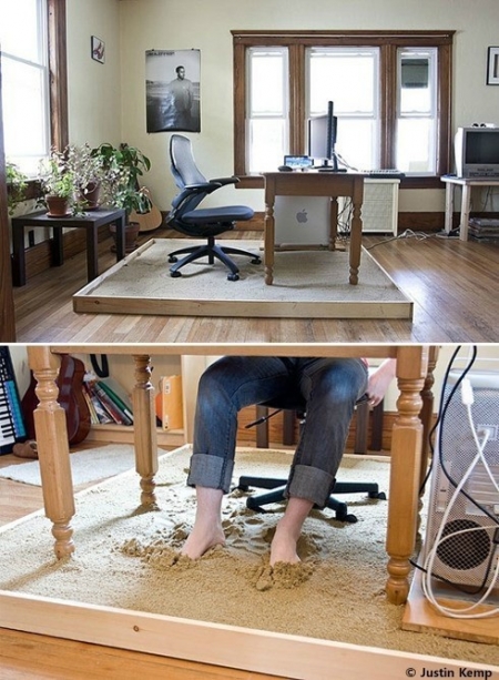 사진은 미국 메사추세스에서 활동하는 아티스트 저스틴 켐프가 고안한 샌드박스의 모습이 담겼다. 책상 밑에 모래를 깔고 맨발로 일을 하면 하루 종일 휴가를 온 듯한 기분을 만끽할 수 있다는 것. 그는 모래가 휴식 또는 휴가의 상징이라고 설명하면서 샌드박스를 공개했다.