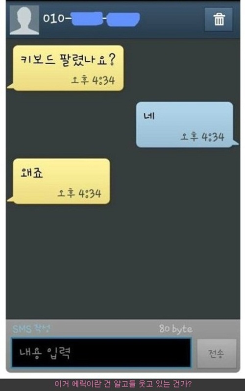 해당 사진 속 구매자는 “키보드 팔렸나요?” 라고 묻자 판매자가 “네”라고 대답했고 이에 구매자는 “왜죠” 라고 되물어 웃음을 자아낸다.