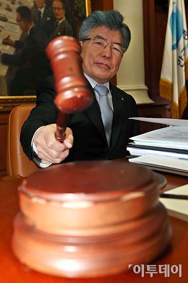 김중수 한국은행 총재가 11일 오전 서울 중구 한국은행 본관에서 열린 금융통화위원회 본회의에서 의사봉을 두드리고 있다.