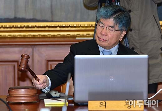 김중수 한국은행 총재가 11일 오전 서울 중구 한국은행 본관에서 열린 금융통화위원회 본회의에서 의사봉을 두드리고 있다.