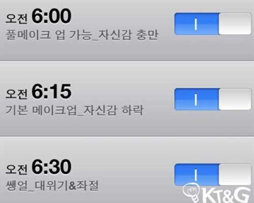 사진 속에는 알람마다 제목이 붙어 있다. 오전 6시 알람에는 ‘풀메이크업. 자신감 충만’으로, 오전 6시 15분 알람은 ‘기본 메이크업. 자신감 하락’이라 적혀있다. 오전 6시 30분에는 '쌩얼. 대위기&좌절'이라고 쓰여 있어 웃음을 자아낸다. 늦게 일어날 수록 화장할 시간이 줄어든다는 의미다.