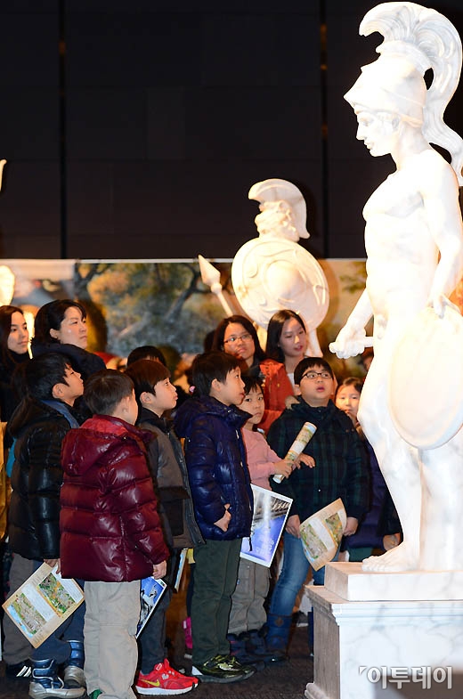 '그리스신화 체험전'이 11일 현대백화점 무역센터점에서 열린 가운데 전시장을 찾은 어린이들이 관계자의 설명을 들으며 신화의 조각상들을 관람하고 있다.