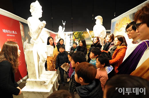 '그리스신화 체험전'이 11일 현대백화점 무역센터점에서 열린 가운데 전시장을 찾은 어린이들이 관계자의 설명을 들으며 신화의 조각상들을 관람하고 있다.