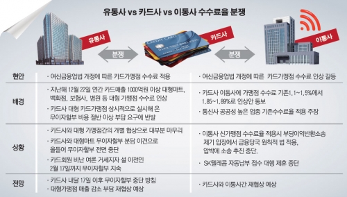 무이자 할부 중단 사태는 작년 말 관련 법 개정으로 카드 매출이 연간 1000억원이 넘는 대형 가맹점의 경우 무이자 할부 서비스를 제공할 때 들어가는 비용 일부를 카드사와 분담해야 하는데, 대형 가맹점들이 비용 분담을 거부하면서 발생했다.