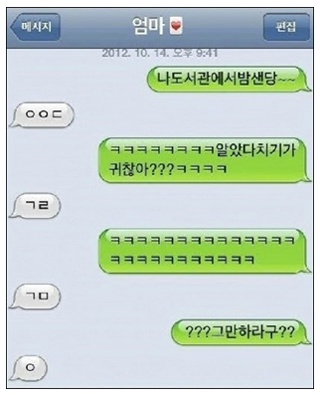 자녀는 엄마에게 '나 도서관에서 밤샌다'라고 문자를 보내니 엄마는 'ㅇㅇㄷ(알았다)'라고 답한 것.