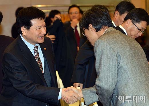 [포토]밝게 웃으며 인사 나누는 이채필 고용노동부 장관