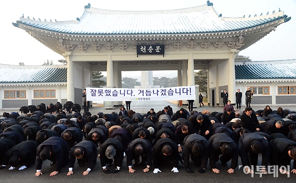 문희상 민주통합당 비상대책위원장과 지도부들이 14일 오전 동작구 국립서울현충원에서 참배한 후 국민들께 사죄의 절을 올리고 있다.