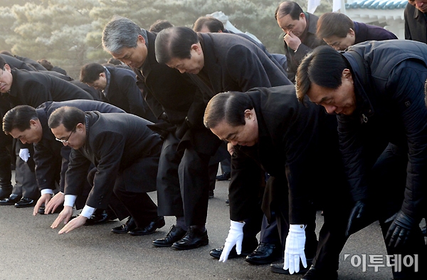 문희상 민주통합당 비상대책위원장과 지도부들이 14일 오전 동작구 국립서울현충원에서 참배한 후 국민들께 사죄의 절을 올리고 있다.