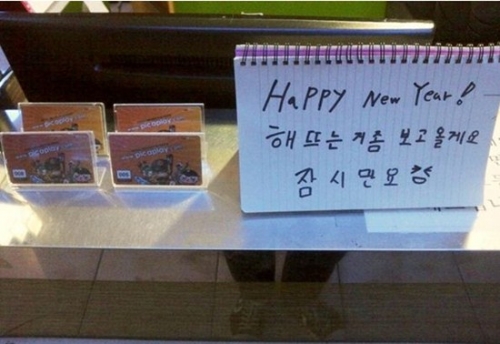 메모에는 'Happy New Year'라며 "해 뜨는 것 좀 보고 올게요. 잠시만요"라고 적혀있다. 알바생은 새해 첫 일출을 보기 위해 근무 도중 밖으로 나가는 패기 있는 모습을 보여 네티즌들의 웃음을 자아낸다.