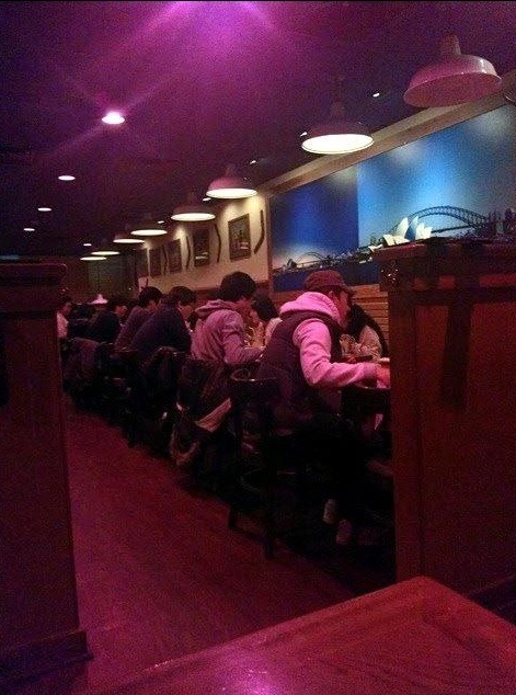 게시물은 까페로 보이는 장소에 안쪽 자리엔 여자가, 바깥엔 남자들이 줄 지어 앉아 있는 사진이다.