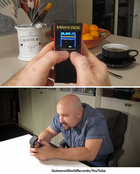 영상 속 게임기는 기네스북으로부터 ‘세계 최소형 게임기’로 인정을 받았다. 이 게임기는 캐나다에 살고 있는 컴퓨터 기술자인 마크 슬레빈스키가 만든 것이다. 크기는 124x52x60mm다.
