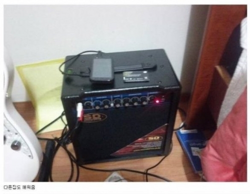 게시물 속 사진은 알람을 맞춘 스마트폰이 앰프와 연결된 모습이다. 작성자는 사진 밑에 ‘다른 집도 깨워줌’이라고 적어 웃음을 자아낸다.