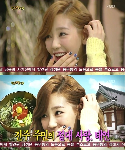 14일 방송된 KBS 2TV ‘대국민 토크쇼 안녕하세요’에서는 태연을 ‘전주 인기녀’라 놀리는 MC 신동엽의 모습이 전파를 타 웃음을 자아냈다. 방송에서는 소녀시대 윤아, 티파니, 제시카, 써니, 효연, 태연이 게스트로 출연했다. MC 정찬우는 “나라별로 누가 더 인기가 있다든지 그런 게 있느냐”는 질문을 던졌다.