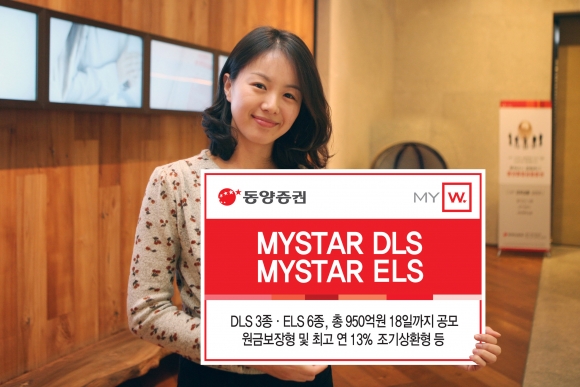 동양증권은 오는 18일(금)까지 나흘간 원금보장형 ELS 1종과 조기 상환이 가능한 원금비보장형 ELS 4종, 쿠폰지급형 ELS 1종 및 원금비보장형 DLS 1종 ,쿠폰지급형 DLS 2종 등 총 9종의 ELS, DLS 상품을 950억원 규모로 공모한다고 15일 밝혔다.