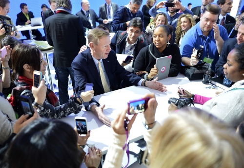 앨런 멀러리 포드자동차 최고경영자(CEO)가 15일(현지시간) ‘2013 디트로이트 모터쇼’에서 블로거들과 대화하고 있다. 포드는 지난해 3분기에 이어 4분기 실적도 호조를 보일 것으로 전망했다. 포드는 올해 1분기 배당금을 기존의 주당 5센트에서 10센트로 두 배 올렸으며 2200명의 인력을 채용할 계획을 밝히기도 했다. 디트로이트/UPI연합뉴스