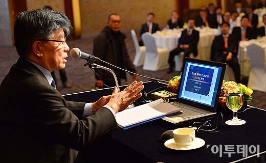 김중수 한국은행 총재가 16일 오전 서울 중구 소공동 롯데호텔에서 한국금융연구원이 주최로 열린 금융경영인 조찬강연회에서 ‘국내외 경제여건 점검 및 2013년 전망’이란 주제로 강연하고 있다.