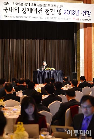 김중수 한국은행 총재가 16일 오전 서울 중구 소공동 롯데호텔에서 한국금융연구원이 주최로 열린 금융경영인 조찬강연회에서 ‘국내외 경제여건 점검 및 2013년 전망’이란 주제로 강연하고 있다.