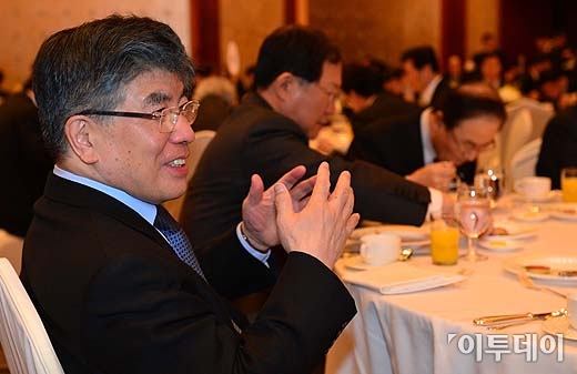 김중수 한국은행 총재가 16일 오전 서울 중구 소공동 롯데호텔에서 한국금융연구원 주최로 열린 금융경영인 조찬강연회에서 참석자들과 대화를 나누고 있다.