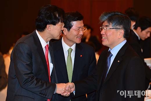 [포토]금융경영인과 인사 나누는 김중수 한은 총재