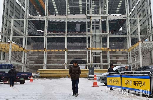 방화로 소실됐던 ‘국보 1호’ 숭례문 복원이 막바지에 들어간 16일 오전 서울 남대문 지붕에 눈이 쌓이고 있다.