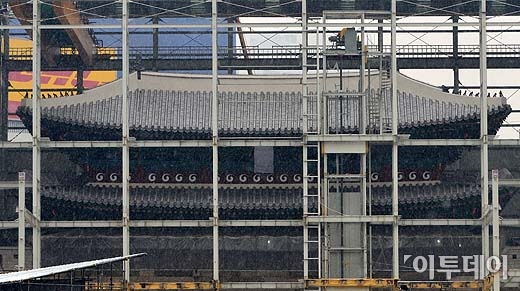 방화로 소실됐던 ‘국보 1호’ 숭례문 복원이 막바지에 들어간 16일 오전 서울 남대문 지붕에 눈이 쌓이고 있다.