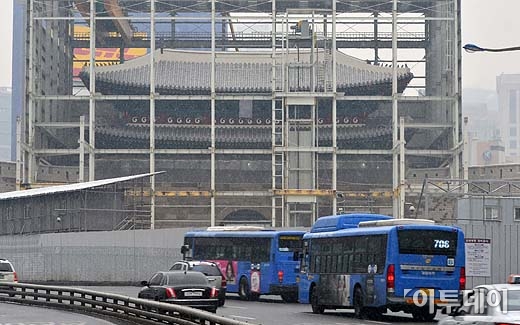 방화로 소실됐던 ‘국보 1호’ 숭례문 복원이 막바지에 들어간 16일 오전 서울 남대문 지붕에 눈이 쌓이고 있다.