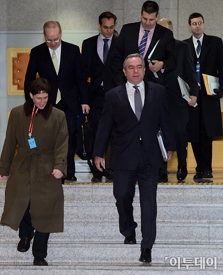 커트 캠벨 미국 국무부 동아시아ㆍ태평양 담당 차관보가 관계자들과 함께 16일 오전 서울 종로구 도렴동 외교통상부 청사로 들어서고 있다.