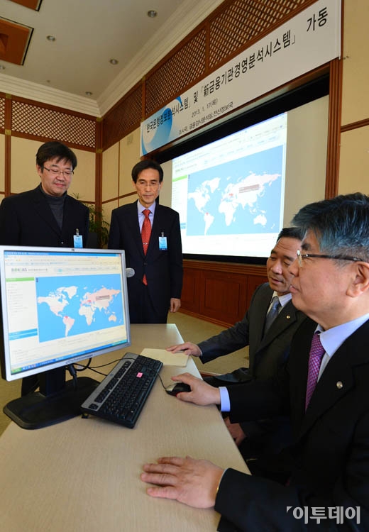 '한국은행정보분석시스템 및 신금융기관경영분석시스템 가동' 기념식이 17일 서울 남대문로 한국은행에서 열린 가운데 김중수 총재 및 주요 참석자들이 시스템을 시연하고 있다.