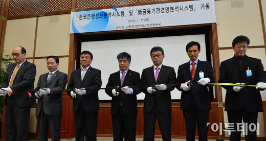 '한국은행정보분석시스템 및 신금융기관경영분석시스템 가동' 기념식이 17일 서울 남대문로 한국은행에서 열린 가운데 김중수 총재 및 주요 참석자들이 테이프 컷팅을 하고 있다.