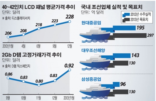 지난해 바닥세를 면치 못했던 반도체와 LCD는 새해를 맞아 평균 판매가격이 급등하고 있다. 극심한 부진에 시달렸던 조선사업 역시 최근 대규모 수주를 이어가며 올해 전망을 밝게 하고 있다.