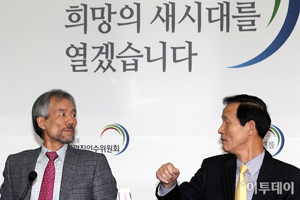 유민봉 인수위 총괄간사(왼쪽)가 18일 오전 서울 삼청동 대통령직인수위원회에서 열린 간사단 회의에서 김장수 외교국방통일분과 간사와 대화를 나누고 있다. 인수위사진기자단