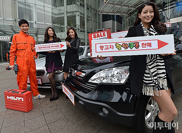 오픈 마켓 11번가는 20일 오전 광화문 청계광장에서 ‘중고차 할인쿠폰 기획전’을 알리는 포토이벤트를 열고 있다. 이번 기획전은 국산차및 외자차 50여대 규모로 마련 되었으며 3종류의 할인쿠폰을 구입해 중고차 구매시 50만원에서 130만원까지 할인받는 행사이다.
