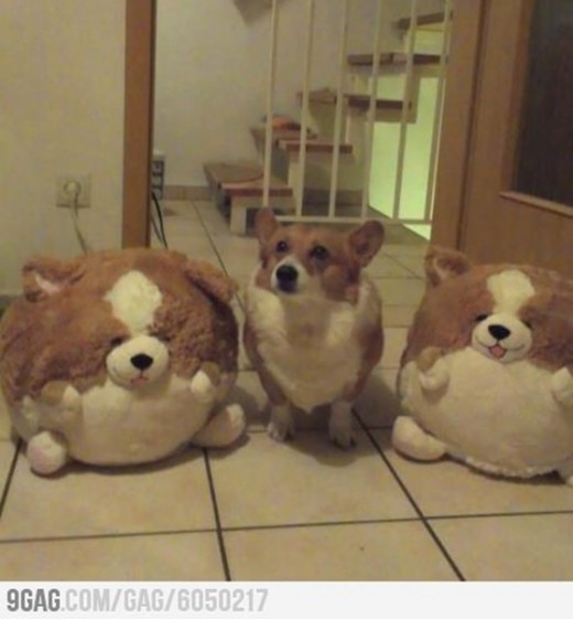 앉아있는 강아지의 모습이 양 옆에 뚱뚱한 강아지 인형들과 모습이 흡사해 마치 인형들 사이에서 숨바꼭질을 하는 것 처럼 보여 눈길을 끈다.