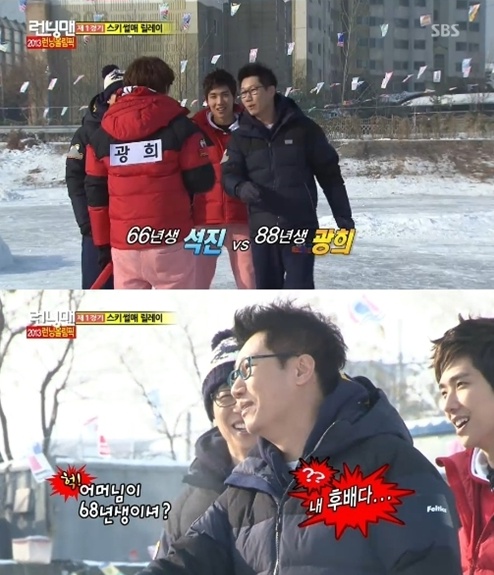 이날 게스트로 출연한 광희는 첫 번째 경기인 썰매스키에서 지석진과 함께 1주자로 나섰다. 광희는 지석진에게 "나이가 어떻게 되세요?"라고 물었고 옆 사람들이 66년생이라고 알려줬다.