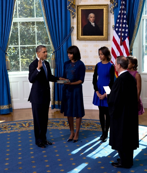 오바마 대통령은 이날 오후 12시경 백악관 블루룸에서 부인 미셸 여사와 두 딸이 지켜보는 가운데 존 로버츠 연방 대법원장 앞에서 취임선서를 했다.