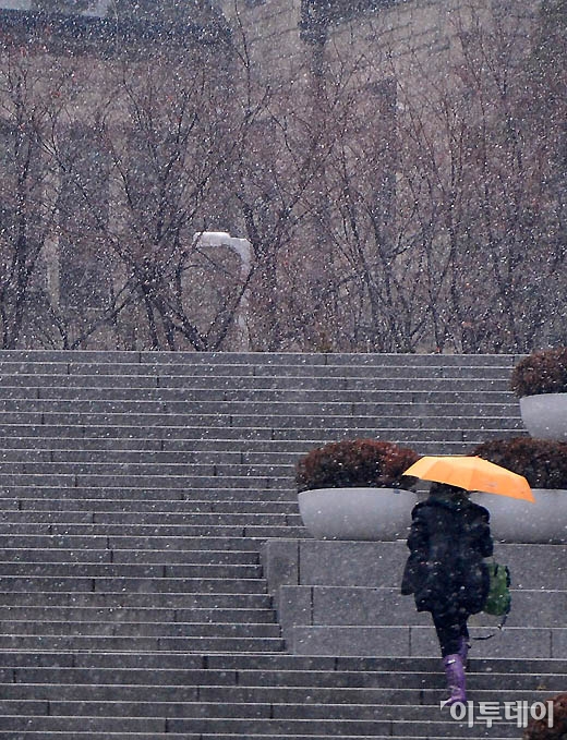 전국 대부분 지방에 눈 또는 비소식이 찾아온 21일 서울 이화여자대학교에서 학생들이 등굣길을 재촉하고 있다. 기상청은 수요일까지 포근한 날씨가 이어지다가 목요일에 눈·비가 내리면서 이후 기온이 떨어질 것으로 전망했다.