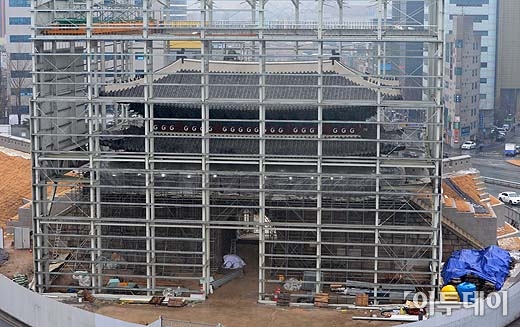 방화로 소실됐던 ‘국보 1호’ 숭례문 복원공사가 막바지에 들어간 21일 오전 서울 숭례문 지붕위를 덮고 있는 가림막이 철거돼 전체모습을 보이고 있다. 2008년 2월10일 방화사건으로 전소된 숭례문은 다음 달 중순 경 복구를 마치고 국민들에게 공개하는 행사를 가질 예정이다.
