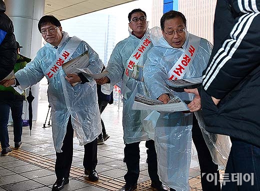 김규한 쌍용자동차 노조위원장을 비롯한 임직원들이 21일 오전 서울역에서 ‘쌍용자동차 정상화 추진과 국정조사 반대를 위한 대국민 홍보활동’을 펼치며 시민들에게 청원서를 나눠주고 있다.