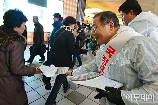 김규한 쌍용자동차 노조위원장을 비롯한 임직원들이 21일 오전 서울역에서 ‘쌍용자동차 정상화 추진과 국정조사 반대를 위한 대국민 홍보활동’을 펼치며 시민들에게 청원서를 나눠주고 있다.