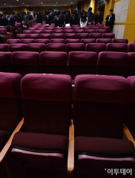 21일 경기 고양시 사법연수원 대강당에서 열린 '제42기 사법연수원 수료식'에 많은 좌석이 비어 있다. 제42기 사법연수원생의 취업률은 지난해 보다 6% 늘어난 46.8% 수준인 것으로 나타났지만, 올해 역시 취업 한파 영향은 비켜가지 못했다. 41기 때와 같이 사법연수생 가운데 절반 이상은 직장을 구하지 못한 상황이다.